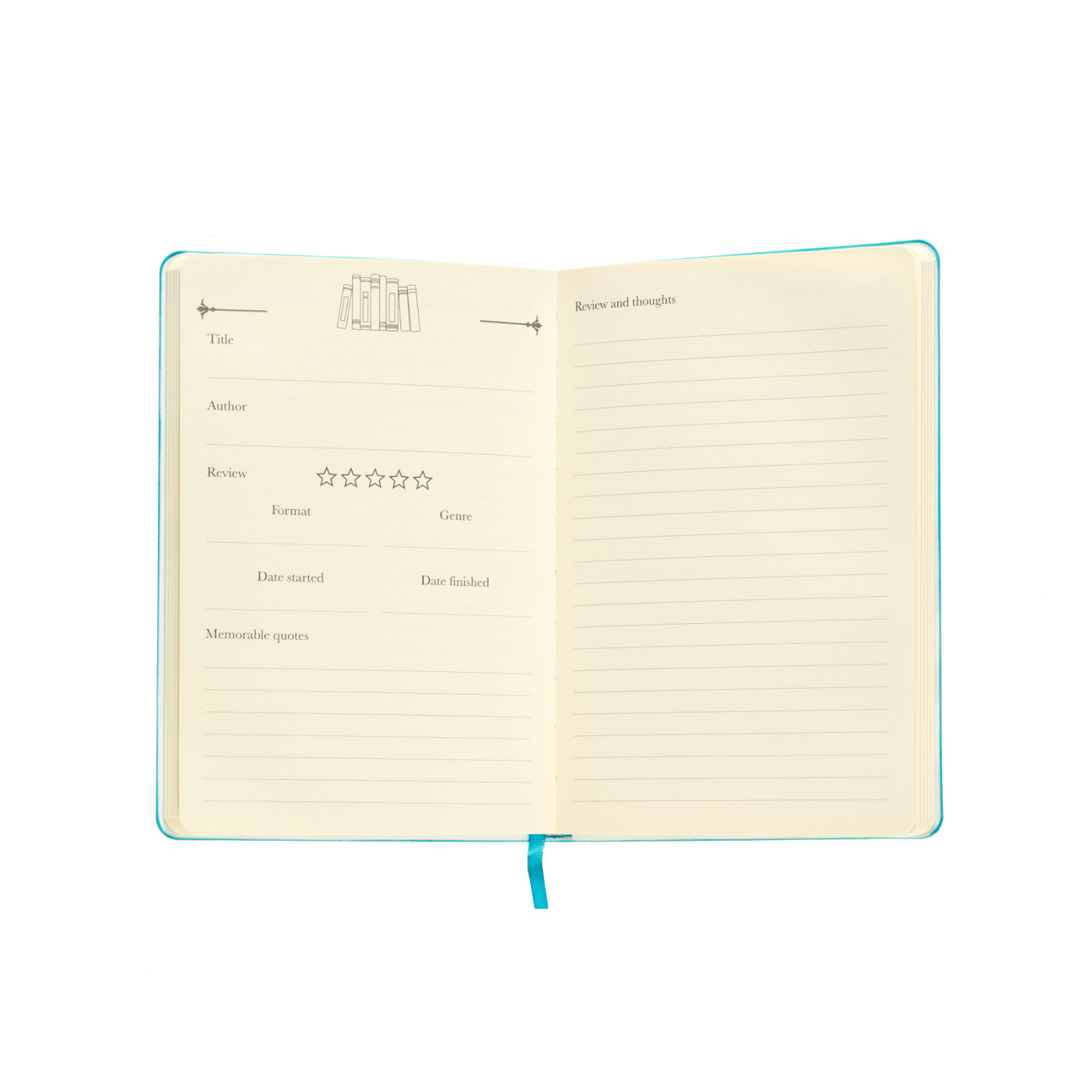 The journal includes a visual book tracker with bookshelf illustrations, allowing you to colour in a book each time you finish reading—an engaging way to monitor your progress and build your own visual library.